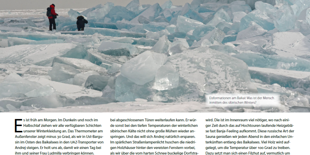 Meine Passion für Reisen ins Innere des wahren Winters führt mich gemeinsam mit zwei Freunden nach Sibirien, an den tiefsten See der Welt: den Baikal. Ende Februar machten wir uns von Irkutsk aus auf den Weg, begleitet von einem russischen Guide als Dolmetscher und Organisator lokaler Verkehrsmittel. Die arktiserprobten Kameras Nikon D750 und Sony Alpha 7 widerstanden auch dem sibirischen Hochwinter: Die Akkus hielten, unter dem Anorak immer wieder angewärmt, bestens durch. Die starken Temperaturdifferenzen zwischen -30°C und +30°C in überhitzten russischen Mannschaftsfahrzeugen verursachten jedoch lästige Kondenswasserflecken auf den Sensoren. Am häufigsten kam das Reisezoom 28–300 mm zum Einsatz – bei minus 30 Grad und Wind will man nicht unbedingt mit bloßen Fingern Objektive wechseln und Schneekristalle ins Innere der Kamera eindringen lassen … .