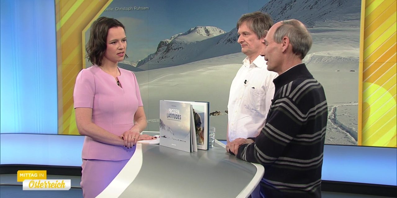 ORF 2 lud am 21.2.2019 Buchautor Christoph Ruhsam (FROZEN LATITUDES) und den Klimaforscher und Glaziologen Prof. Dr. Wolfgang Schöner (Austrian Polar Research Institute APRI) zu einem Live-Interview in “Mittag in Österreich” ein. TV-Moderatorin Gaby Konrad beleuchtete den Wert des Buches durch die Darstellung unberührter Arktischer Landschaften über einen Zeitraum von 30 Jahren sowie den Auswirkungen des Klimawandels auf die Hohe Arktis. Eine interessante Konversation!